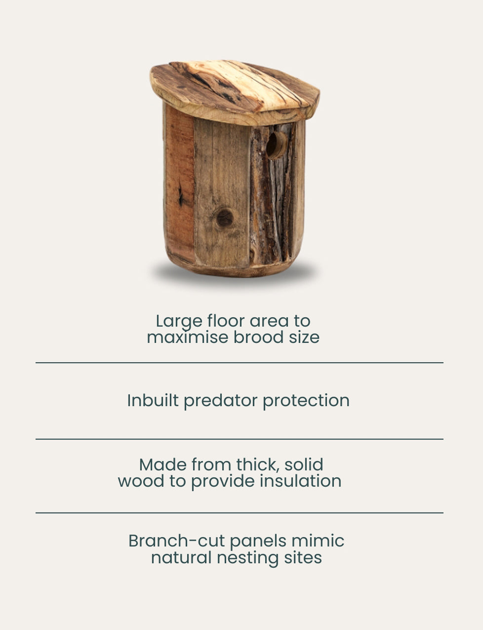 The untreated, rough interior combined with the tree-like shape of our bird boxes provides an instant sense of familiarity and security. This thoughtful design enhances the chances of occupancy.